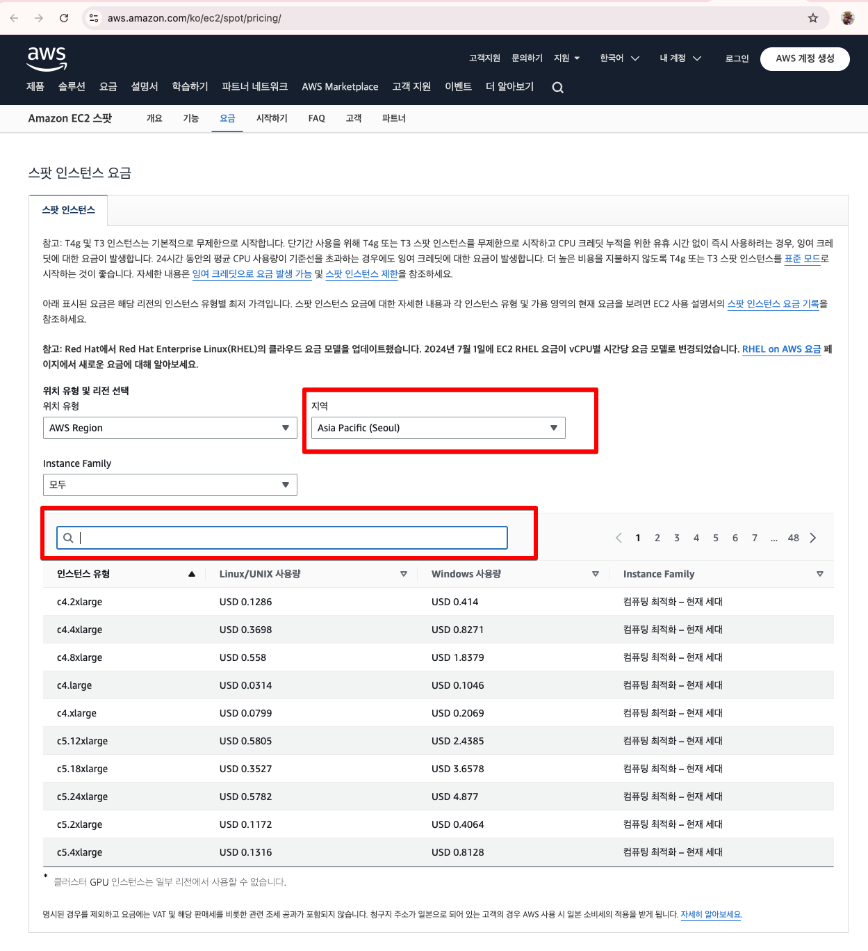 이미지와 같이 https://aws.amazon.com/ko/ec2/spot/pricing/ 해당 주소에 접속 해 지역(Region) 을 선택후 인스턴스 타입을 체크해서 시간당 요금을 확인한다.