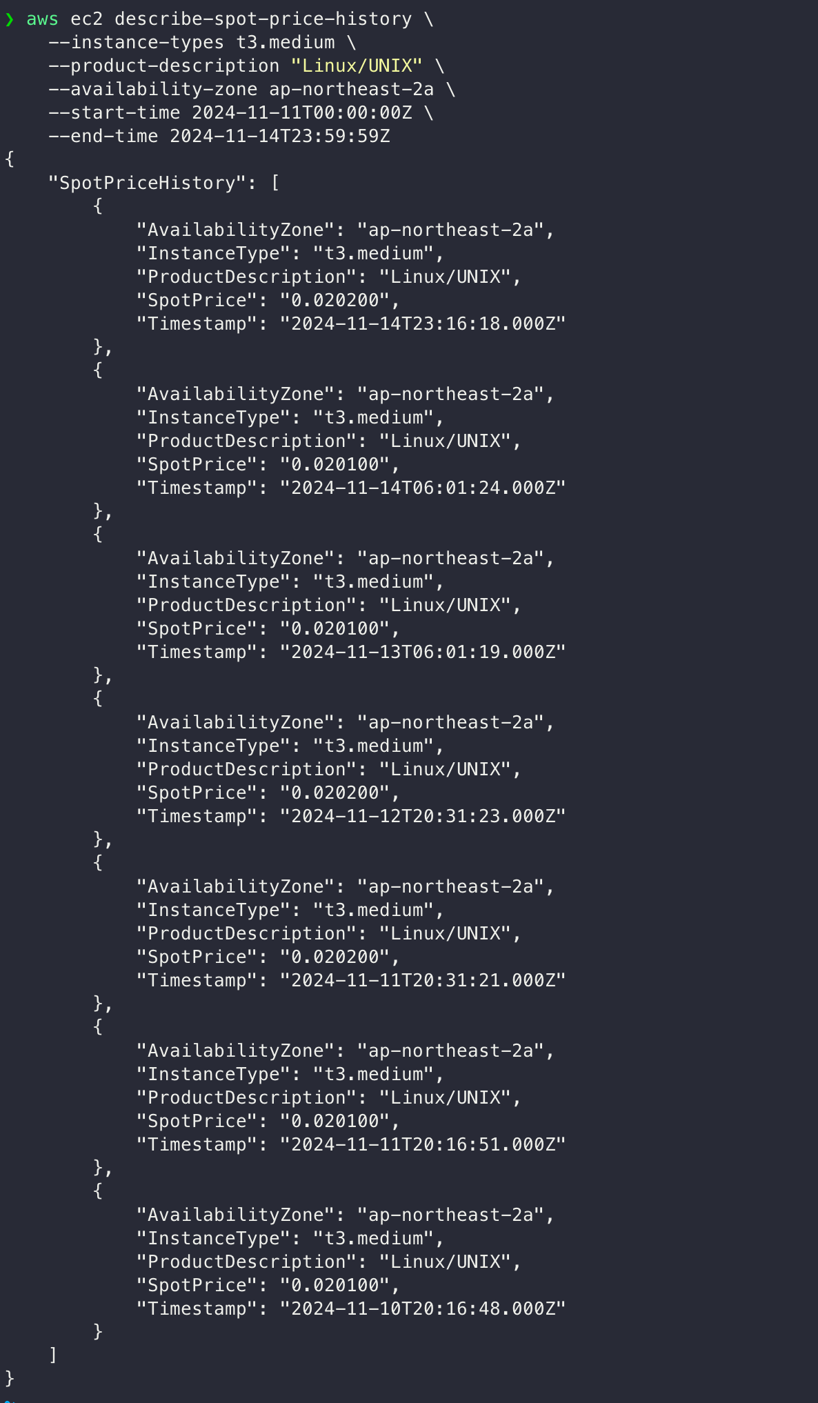 print(f"Spot Price History for {instance_type} in {availability_zone}:\n")